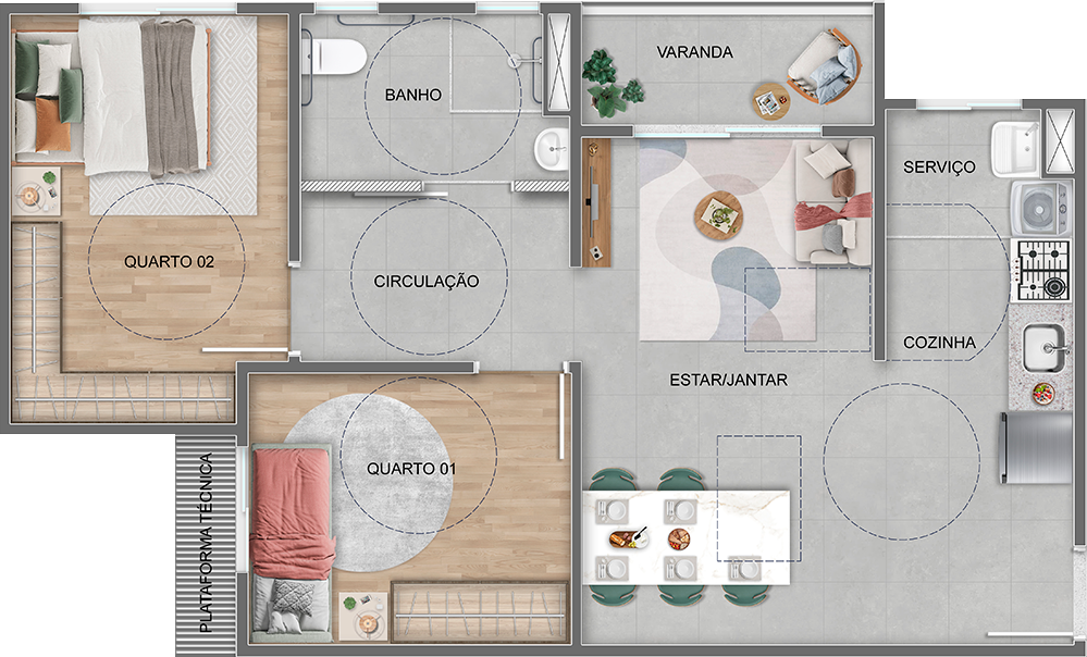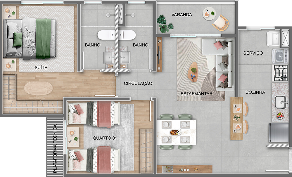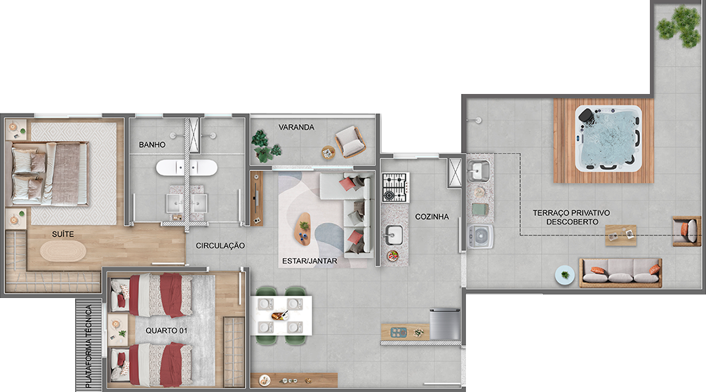 Desenhado para favorecer a mobilidade, o apartamento internamente acessível garante circulação mais ampla e funcional, sem perder o aconchego. Acabamentos modernos, infraestrutura para ar-condicionado, tomadas USB e fechadura eletrônica tornam a planta ideal para todas as idades e necessidades específicas.