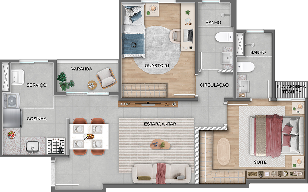 Planta prática e bem resolvida, com 2 quartos, suíte e acabamentos modernos. Infraestrutura para ar-condicionado, pisos de qualidade, fechadura eletrônica e tomadas USB deixam tudo pronto para morar com conforto, tecnologia e um ótimo aproveitamento dos metros quadrados.